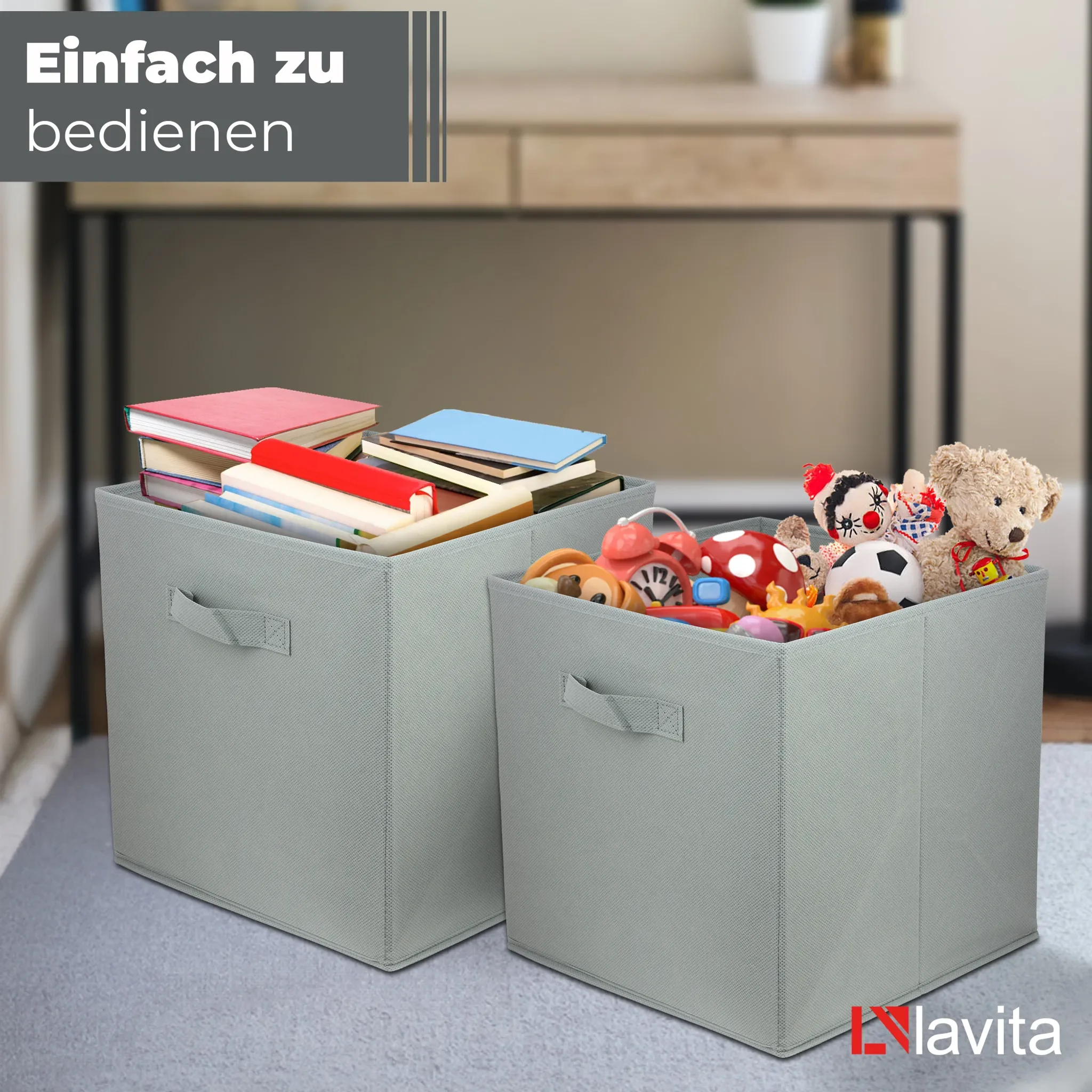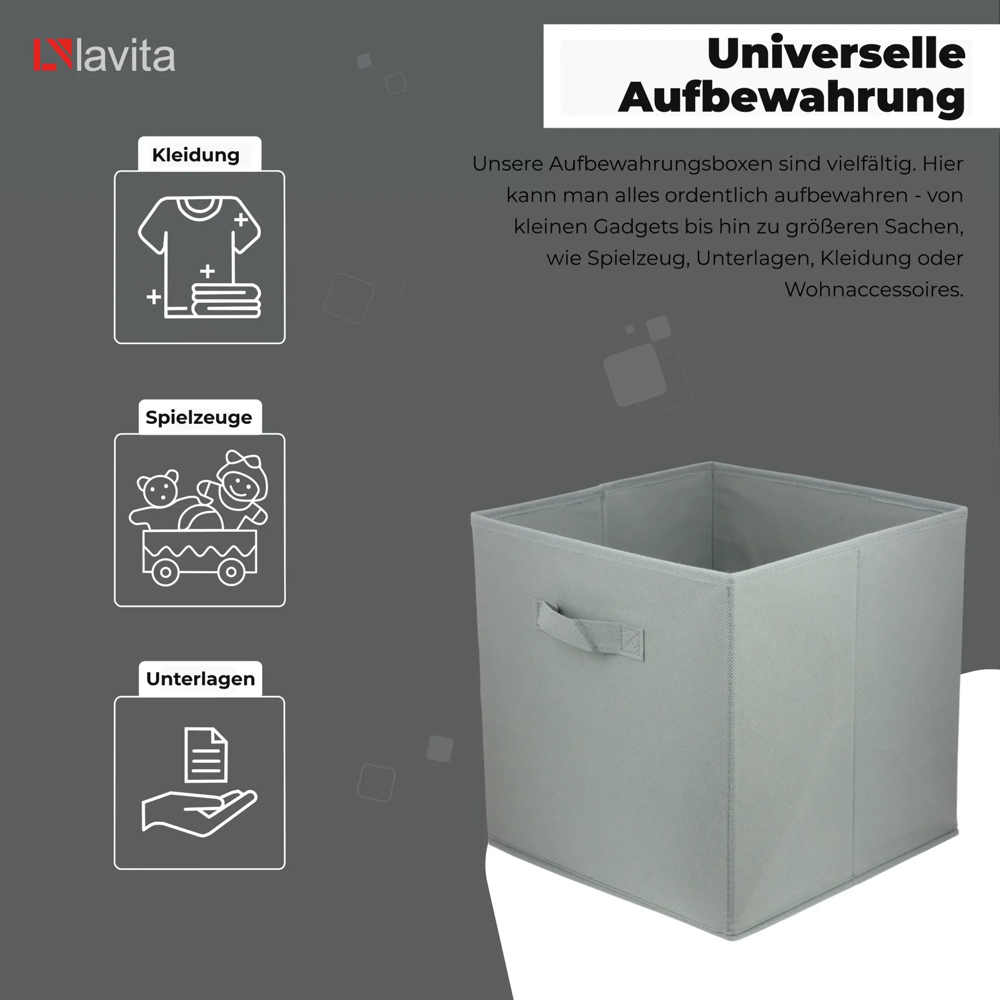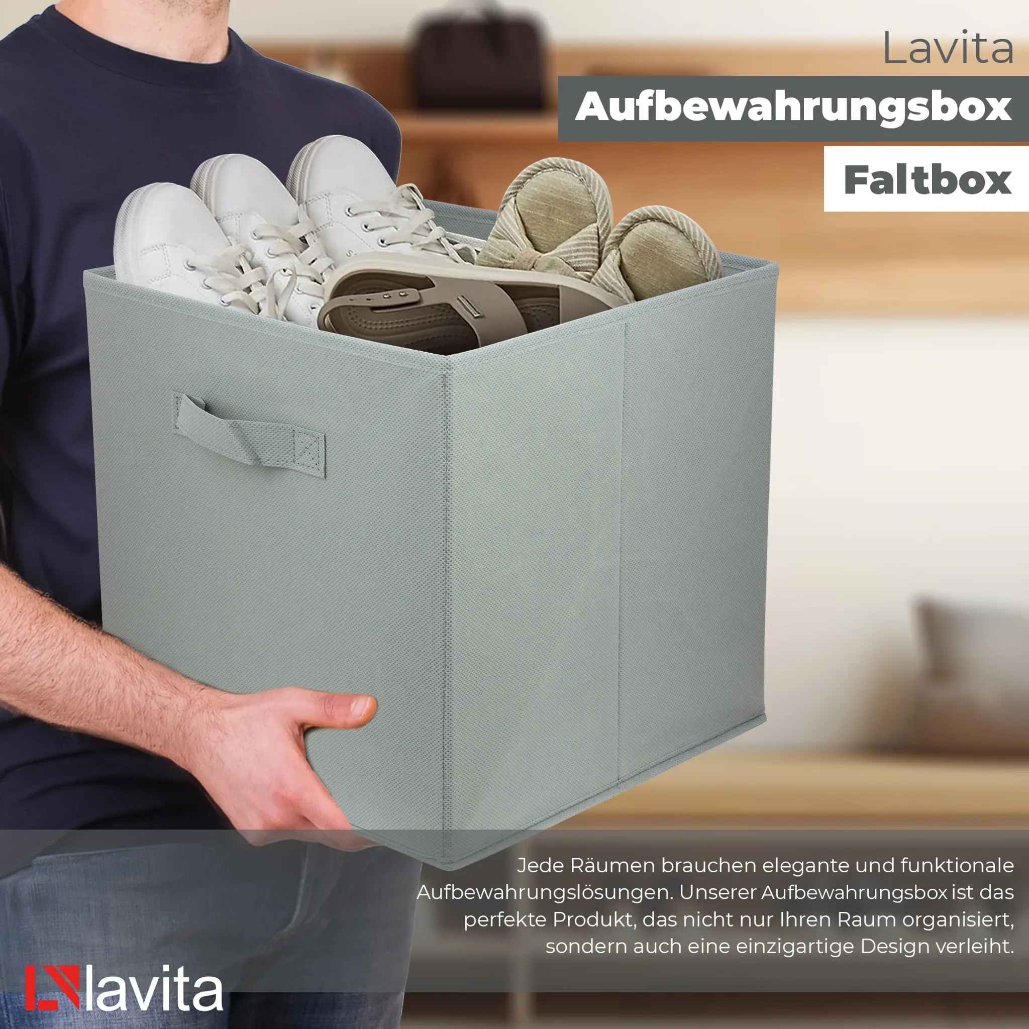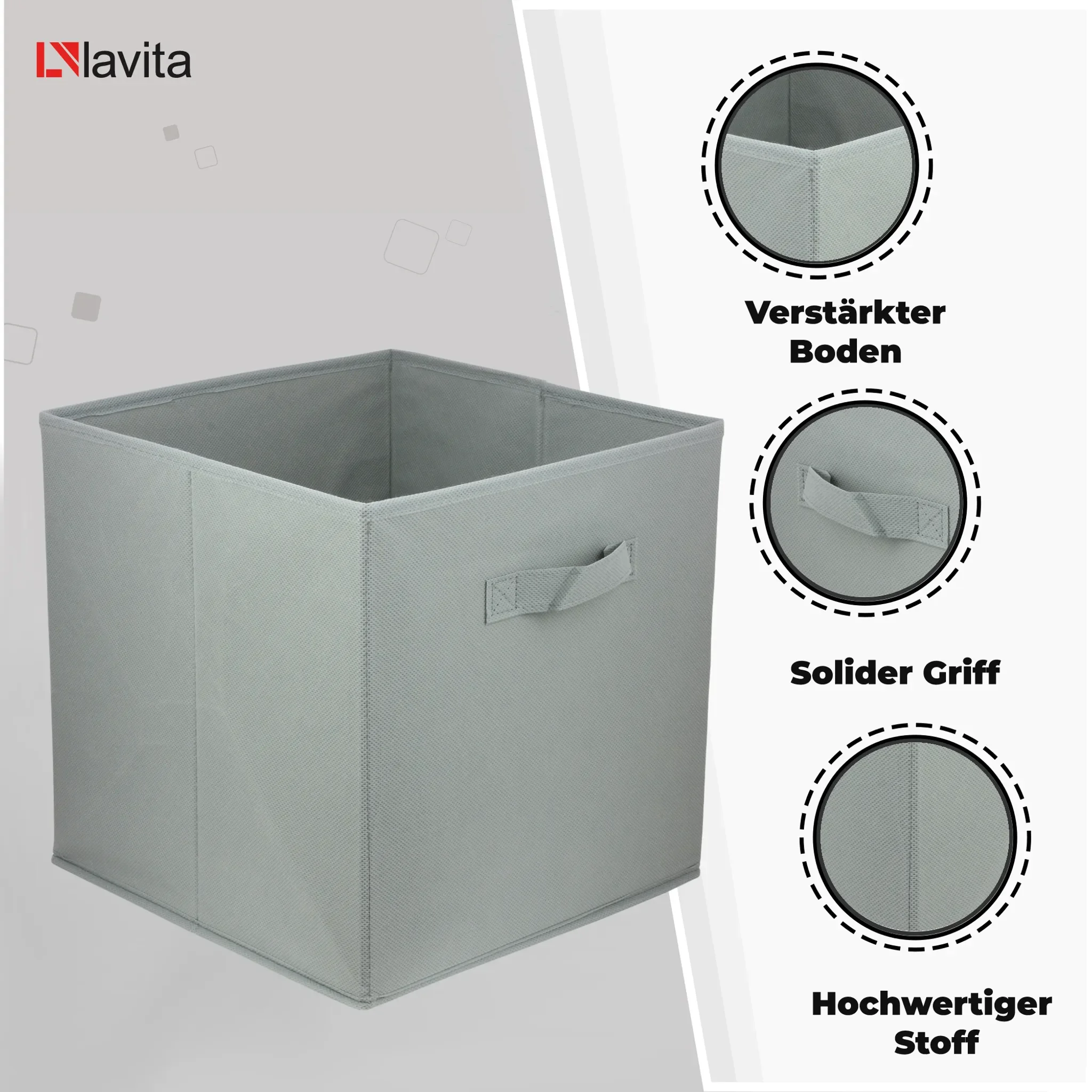 Die dezente hellgraue Farbe fügt sich harmonisch in moderne wie klassische Einrichtungen ein. Dank des faltbaren Designs lässt sich die Box bei Nichtgebrauch flach zusammenlegen. Ein verstärkter Stoffgriff erleichtert das Herausziehen und den Transport.