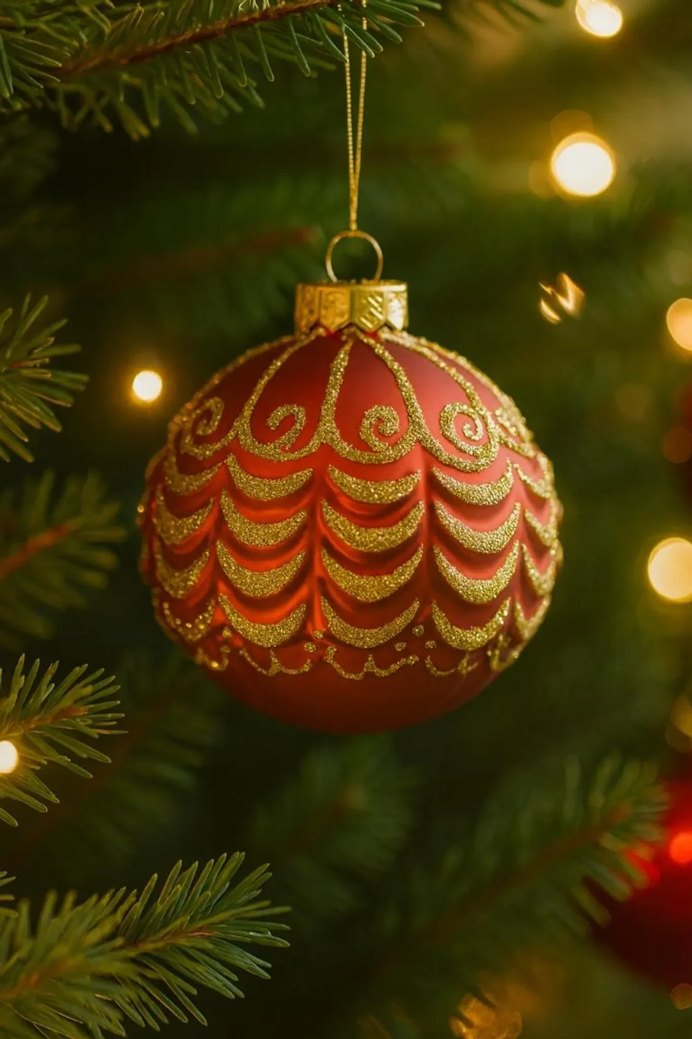 Durch die Kombination von Rot und Gold reflektiert die Kugel das Licht der Baumbeleuchtung besonders schön und schafft eine gemütliche Atmosphäre. Perfekt für klassische sowie moderne Weihnachtsdekorationen.