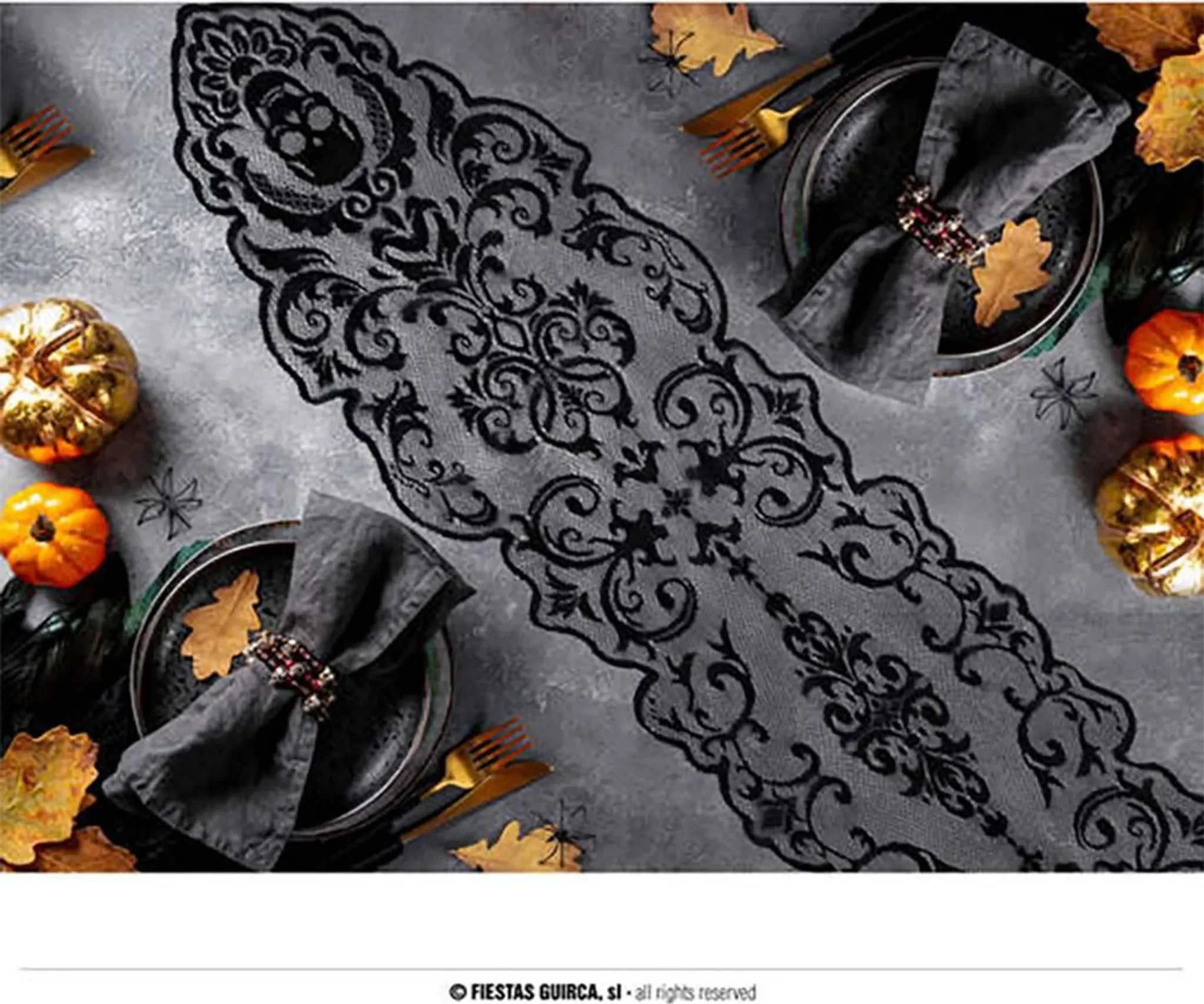 Verwandeln Sie Ihren Halloween-Tisch in ein faszinierendes Zentrum der Aufmerksamkeit mit diesem Tischläufer aus schwarzer Spitze mit Totenkopf-Motiven. Ideal für Dinnerpartys, festliche Tische oder thematische Halloween-Events.
